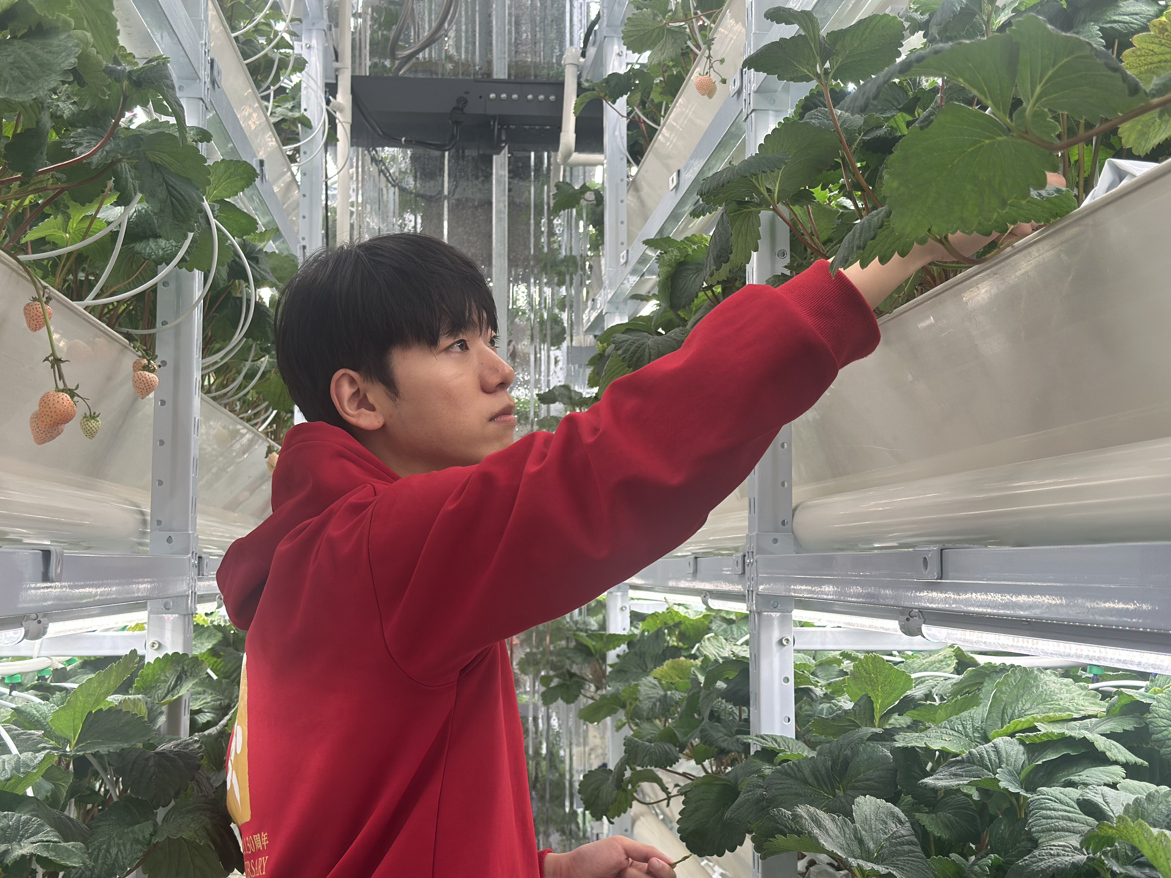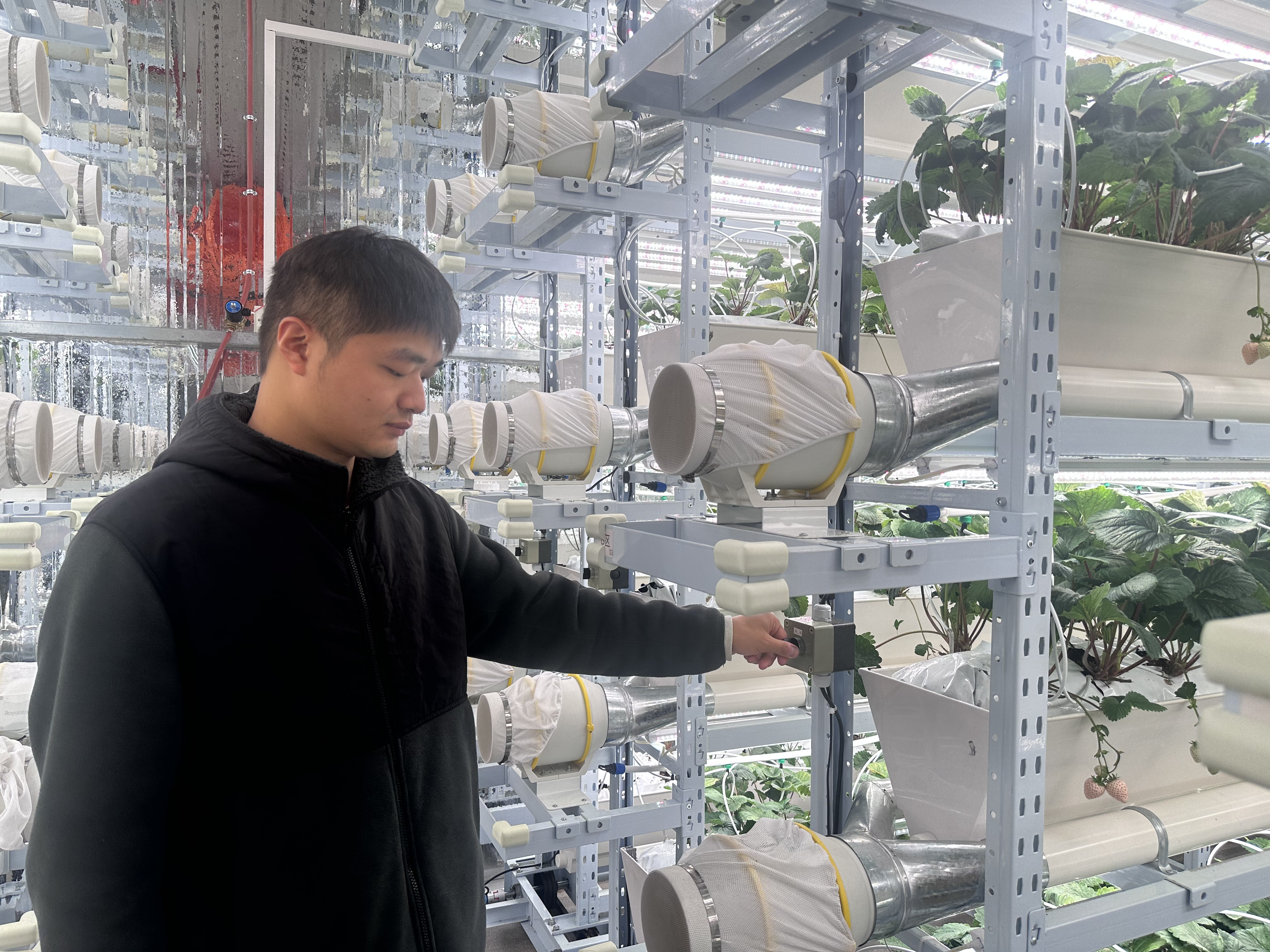 △吕兆晨在草莓植物工厂调整种植设备