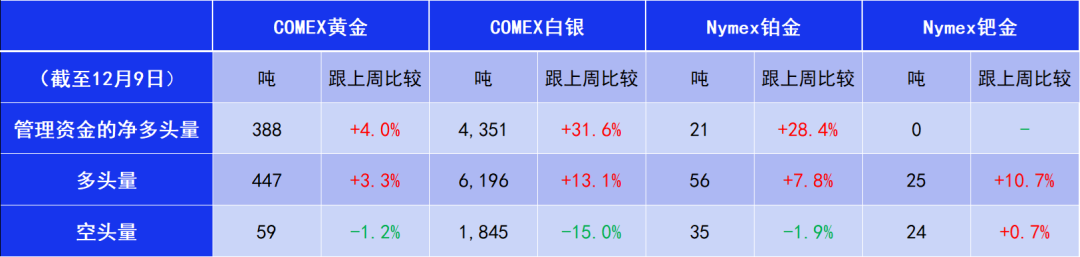 至12月初为止,各金属的基金多头上涨,当中钯金合约经历了164周(自2022年10月23日起)基金净空后,终于恢复净多头。